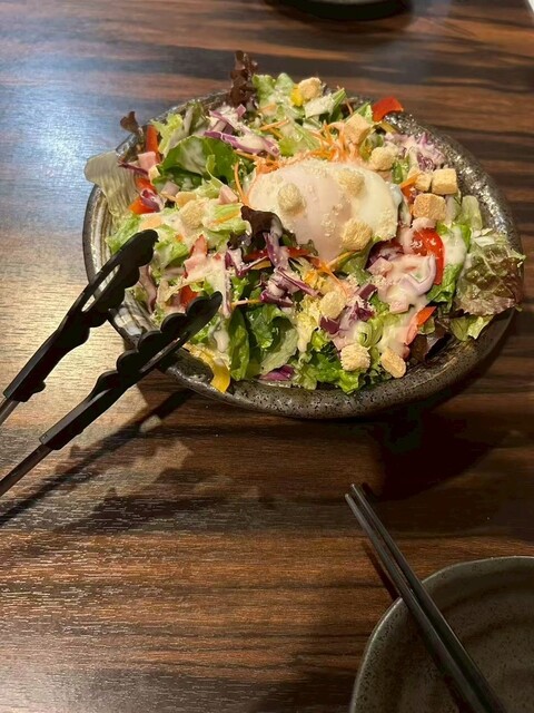 まずいただいたのはサラダ。写真では、たっぷりの葉物野菜にクルトンと温玉がのった一皿で、シャキッとした野菜にコクのあるドレッシングと温玉がよく絡み、最初の一皿として食べやすい味わいでした。
