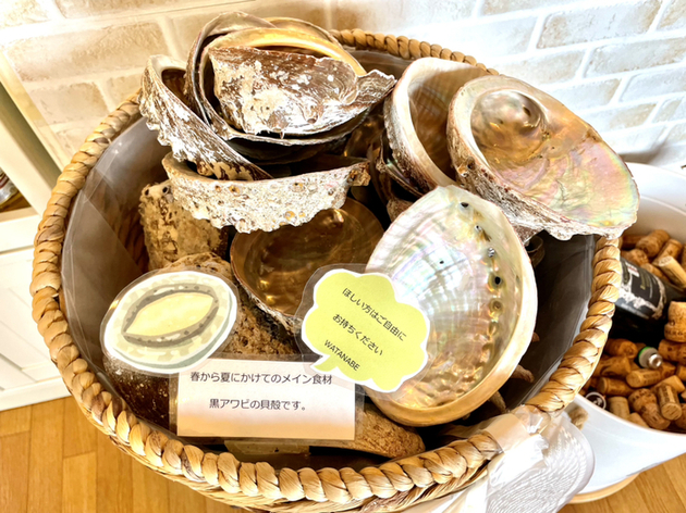 メイン料理に使われた黒鮑の殻。記念にいただくことができます。