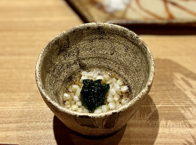 蕎麦の実 海苔。優しいお出汁に海苔の風味を堪能。始まりに相応しい上品さです。