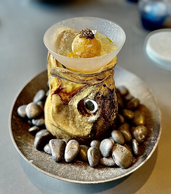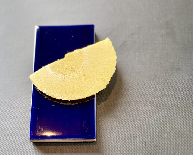 カラスミのプレス煎餅。こちらはメニューにはないお料理。シェフが選んだ青のタイルでの提供スタイルは映えますね♪
