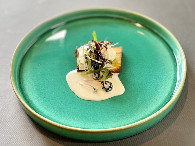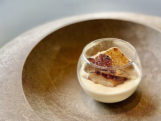 トラフグのフラン 昆布(北海道)GV・白子のソース・トリュフ。