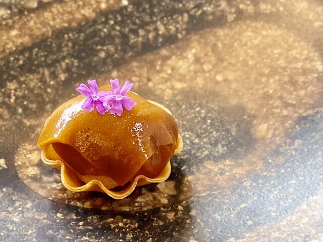 㭭きたての蛤をフリットにする事で、旨みを逃さずい ただけるのでジューシーさ抜群!自家製アールグレービネガーが味を引き締め、富津の海苔が全体をうまくまとめ上げています。