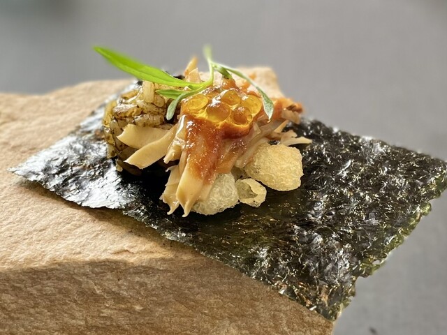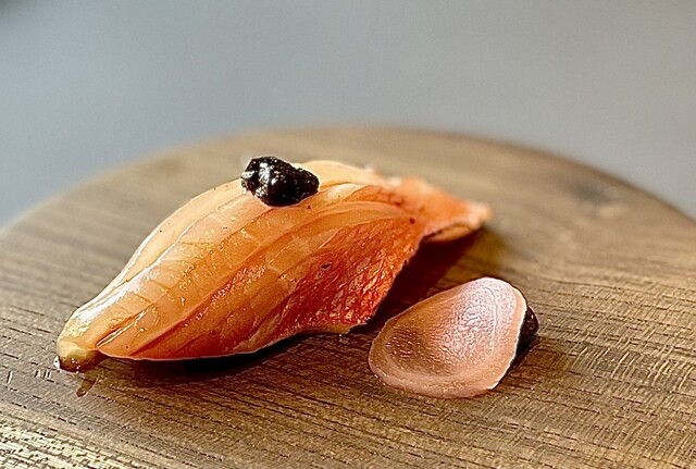 シャリは千葉県産コシヒカリと古代米のミックス。ローゼルビネガーで酢飯に。ネタは銚子産の金目鯛。間にはトリュフ風味の卵黄が隠されていて、口に入れた瞬間と噛みしめるごとに何度も違う顔を覗かせる。