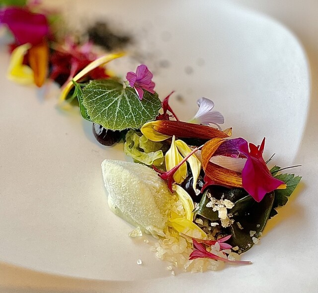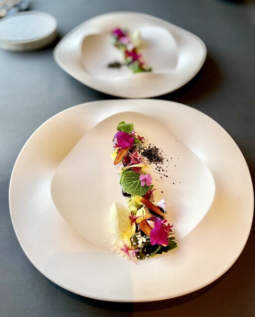 Sugi畑をお皿に乗せて。自家菜園のマイクロハーブが鮮やかで、アートな一皿。