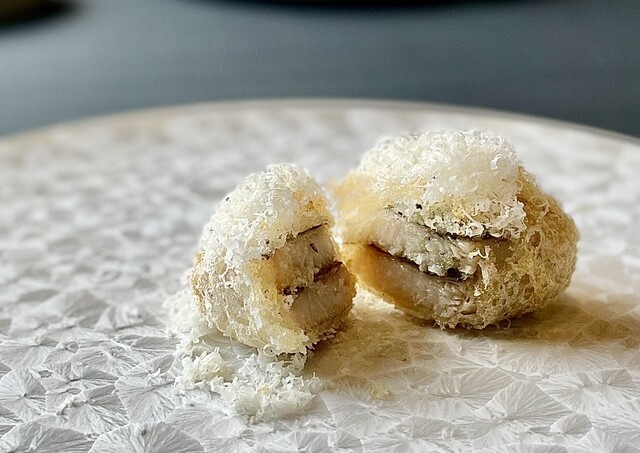 GV(ガストロパック)を施した鱧に、ヤマドリダケのエキスを浸透させフリットに。