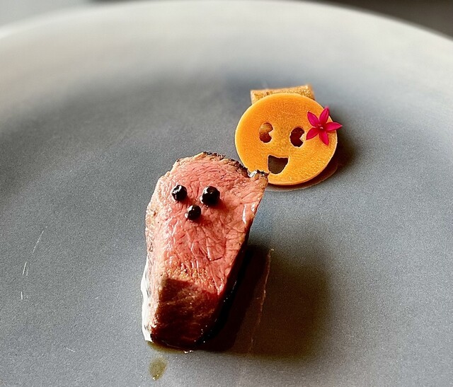 High & Low ステーキ 。八千代牛シャトーブリアンを使用。蜂蜜・こおろぎ醤油・山崎12年・発酵ブルーベリー漬けの牛肉はスッとナイフが入る柔らかさ。笑顔の人参にもほっこりです♡
