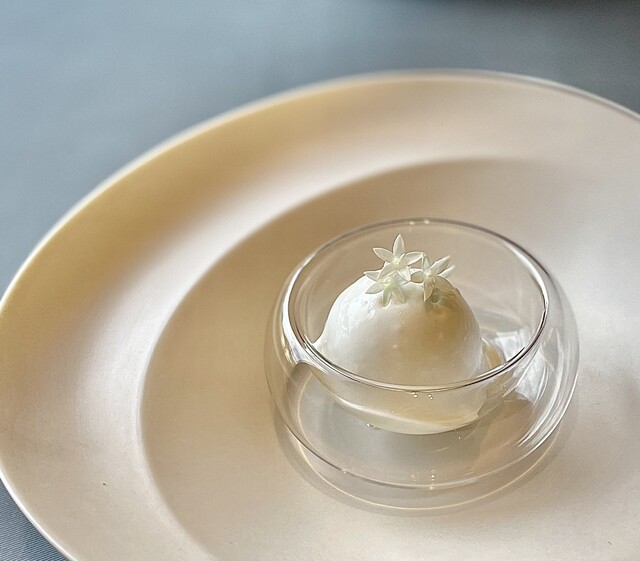 大地の恵み。木更津水牛ミルクをゼラチンで固めたものに超希少な蜂蜜を合わせた一皿。濃厚なミルクに花の香りが広がる一品。華やかな蜂蜜は上品な味わいです。