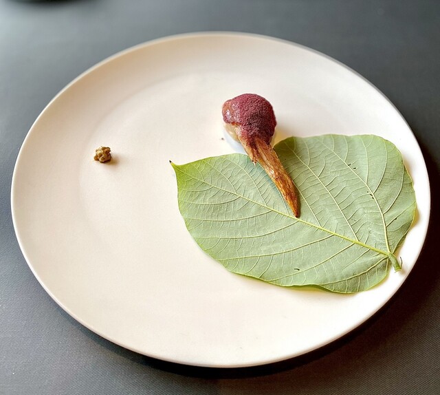 初めていただくキョンのコンフィ。鮮やかな色のソースは紫キャベツの発酵エキス。シェフオリジナルのマヨネーズソースも抜群にマッチしています。