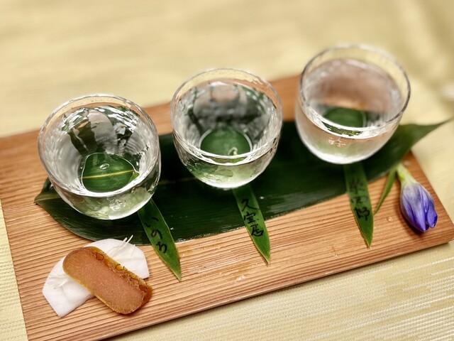 かわせみオリジナル 日本酒飲み比べ!好みの3種と自家製からすみのセット。『純米大吟醸いのち』『純米大吟醸 久宝居』『大吟醸 栄四郎』をセレクト✨