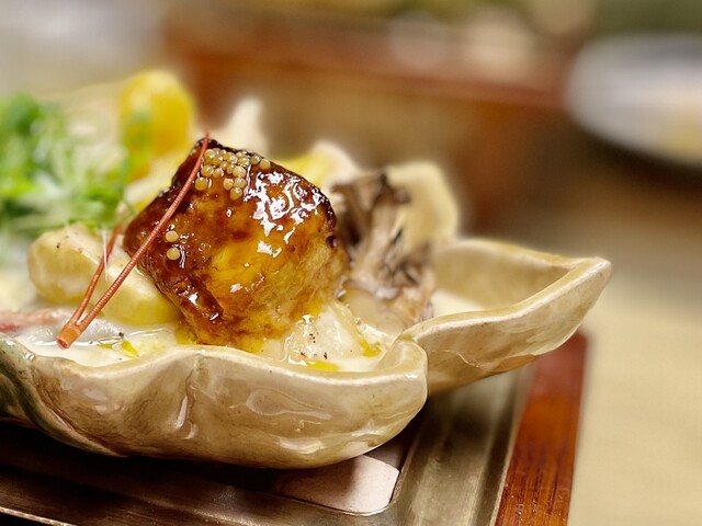 進肴『甘鯛かぶら蒸し』癖がなく滋味豊かな甘鯛と海老芋とキクラゲ。フワッと食感にたっぷりの銀餡に生雲丹の豪華トッピングです。