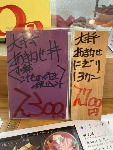 開店前に到着。店前でメニュー眺めていると10分前に暖簾が出たので入店。すると大将からいらっしゃいませ、の大きな声。何にしようか考えていると、大将から「スペシャルおまかせ丼」をおすすめされましたが、やっぱり今月限定の本鮪大トロ丼にすることにしました。注文して程なく提供された丼ぶりみてびっくり。これでもか、と美味しそうな大トロが盛られています。切り身もかなり大きく厚みもありました。口の中で溶けて甘味も強くほんとに美味しかったです。退店までひとりでしたが、11時30ごろ辺りから店内いっぱいになるそうです。開店直後が狙い目かもしれません。今度は中トロ丼や大将おすすめのおまかせスペシャル丼食べたいと思います。ご馳走様でした。