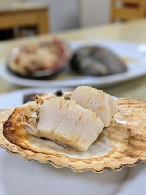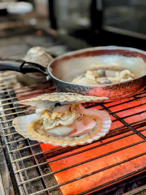 何故かホッキ貝を焼き始め、「ウメェから食ってけ。」