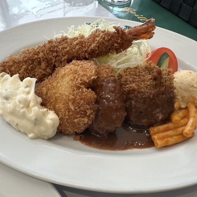 エビの食べ応え、柔らかい白身魚、ジューシーなミンチカツ