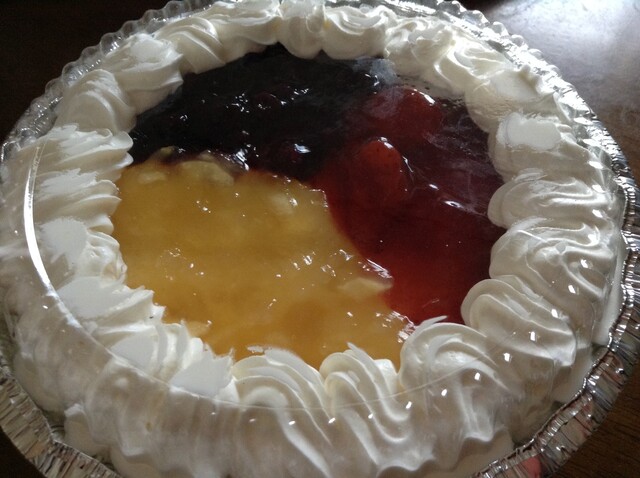 三色パイは底の薄いパイの上にカスタード、同じ厚さのスポンジがふわふわで