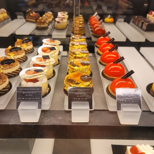 タルトの上に角切りさつまいも、生クリーム、黒ごまソースちょこっと、さつまいもチップス、さつまいもブリュレ、黒ごま、チョコレート、金箔。
