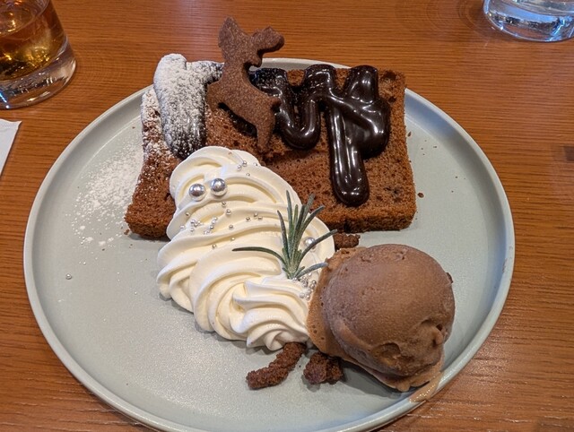 メインの料理を何種類かの中から選び、サラダ・パン・カレー・ドリンクはビュッフェになっています。メインを宮崎県産 きなこ豚のチャコールグリルとプライムビーフ(牛サガリ)のチャコールグリル マッシュポテト添えをチョイス。カレーが美味しくおかわりしました(笑)最後にクリスマスバージョンのシフォンケーキを食べて終了です。椅子の高さとテーブルが合っていなかったのが少し食べにくかったでっす。