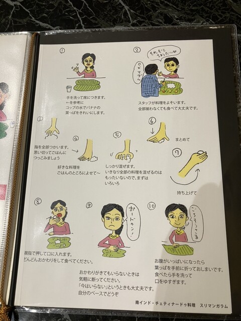 バナナリーフのミールスは初ですがメニューと一緒にミールスの食べ方、マナーのイラストがあるので初めての人でも安心です。