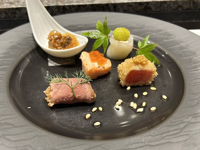 鮪カダイフ揚げ 蒸し鮑 翡翠銀杏)