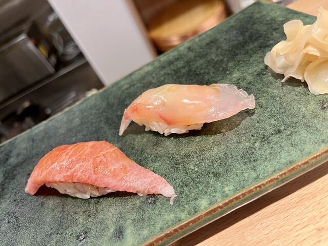 メニューはイワシ巻きやタラ白子、白エビ天ぷら、お任せの寿司などを注文。