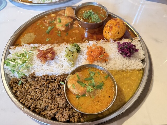 結局、3種のカレーとなったので、すごくボリューミーだったけど、あっという間に口の中へ流れ込んでいきました。これはリピの価値あり。牡蠣海老、フィッシュ、ポークそれぞれのうまみとスパイスを感じながら混ぜた後の味わいを感じることができる。うまみやスパイスが一つになるわけではなく、それぞれが引き立つようなプレートだった。またすぐに行きたいです。おすすめです。