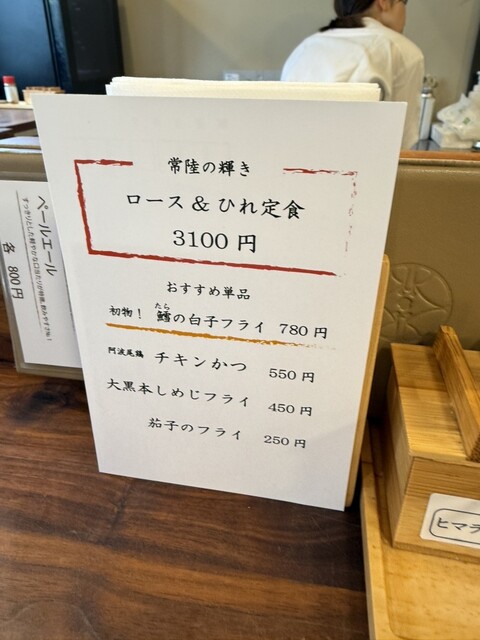 予約時、しゃ豚ぶりあん定食(3600円)をオーダー済み。当日着席後、牡蠣と白子の海鮮2種フライ(1000円)を追加オーダー。