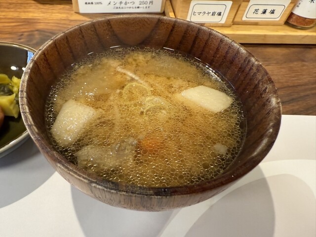 まず、値段は食べたら全然高いと感じなかった。むしろ安く感じた。とんかつは最高の豚質、最高の油、最高の揚げ技。肉の断面がピンクに光っていた。これまで見たことがない艶のある断面だった。すごいボリュームなんだけど、しつこさやもたれが全くない。追加したチキンカツは、とんかつと同じクオリティ。やはり三位一体。ただ、リブロースに比べると、まだ、塩が雑味に感じない余地があるような気がした。ただ、これはとんかつとチキンカツそのもののポテンシャルの違いでしょう。ごはんは一人ひと釜、釜炊きごはん。宮城県産ひとめぼれ。固さ、水分ともに最も個人的にも好きなチューニングだった。ごはんも、とんかつと食べるというより、汁物だけで別々に味わって食べた。それくらい、旨味が独立して充実していた。あと、黒豆ほうじ茶が出されるけど、これがまた美味しかった。