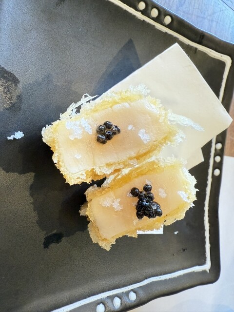 まず、海鮮2種の牡蠣から。生食用だそうで今シーズン初めての牡蠣フライ提供とのこと。ということは、開店同時入店の私が、今シーズン初の牡蠣フライを食べたことになる。光栄。これが超絶のクオリティ。生食用だけあって磯の風味と旨味が詰まった塩味が口の中に広がる。じゅわーと広がる。その風味と旨味を柔らかく包み込むフライという感じ。こんな超絶牡蠣フライは初めて食べた。白子のフライも美味しかったけど、牡蠣フライの残像が頭の中、口の中からまだ消えない。