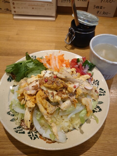 ベトナム風混ぜご飯(コムアンフー)1,000円✨スープつき。この日の週替わりメニュー♪香味野菜や挽き肉をよく混ぜ、ニョクマムや卓上のスイートチリソースやガーリックソースで頂きます。