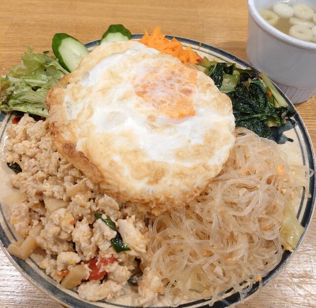 写真追加✨️鶏ひき肉と軟骨のガパオライス1,100円+パクチー150円+スープを魯白菜(ルーバイツァイ)に変更150円!12月上旬の週替わり♪白菜と豚肉煮込みの台湾料理がスープに♡目玉焼きも半熟。