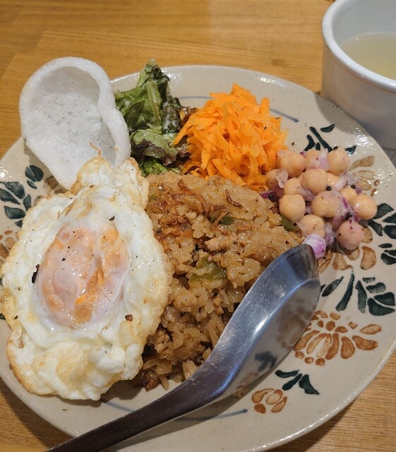 ナシゴレン1,000円✨5月下旬の週替わりメニュー♪ピリ辛のインドネシア風チャーハン。フライドエッグが半熟でいい仕事!サクサクのえびせんやに副菜も最高です。