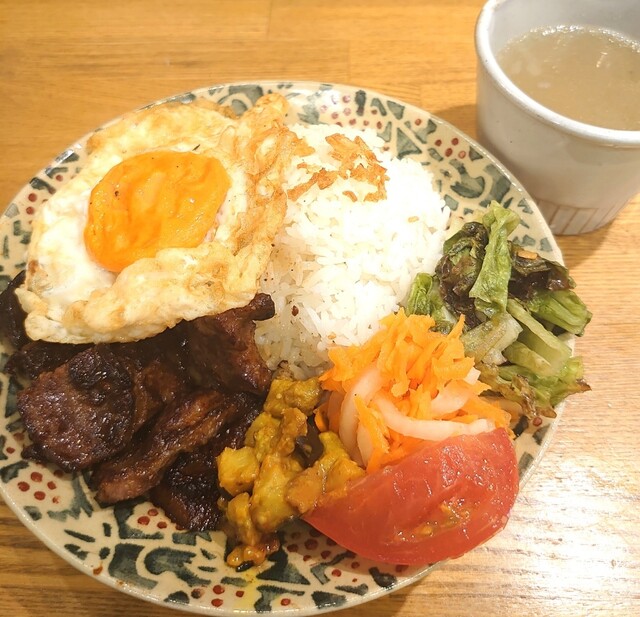 写真追加:7月上旬の週替わりメニューでコムタム風ごはん(ベトナム風豚肉ごはん)1,200円✨ガツンとニョクマムや醤油の漬けダレで豚肉のグリル焼き!副菜も豊かでご飯が進みます♪こう見えて半熟卵♡