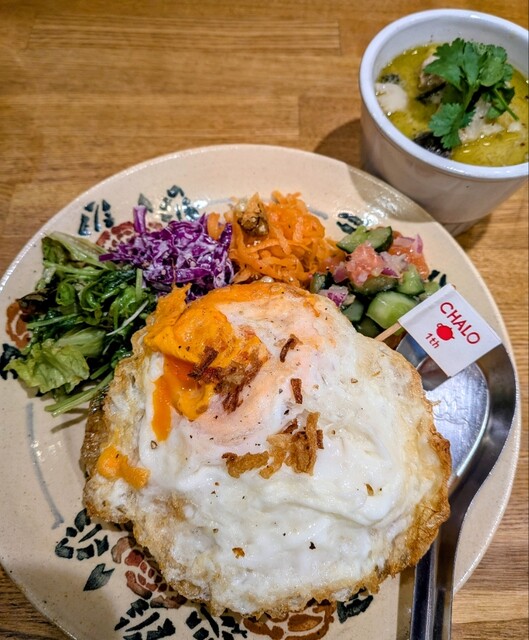 カオラートゲーン(タイのぶっかけ屋台ご飯)1,300円+目玉焼き100円✨メニューから3種を選べるGWスペシャルメニュー♪鶏挽肉と筍のガパオ、パットウンセン(春雨炒め)、小松菜のタイ風炒めを♪