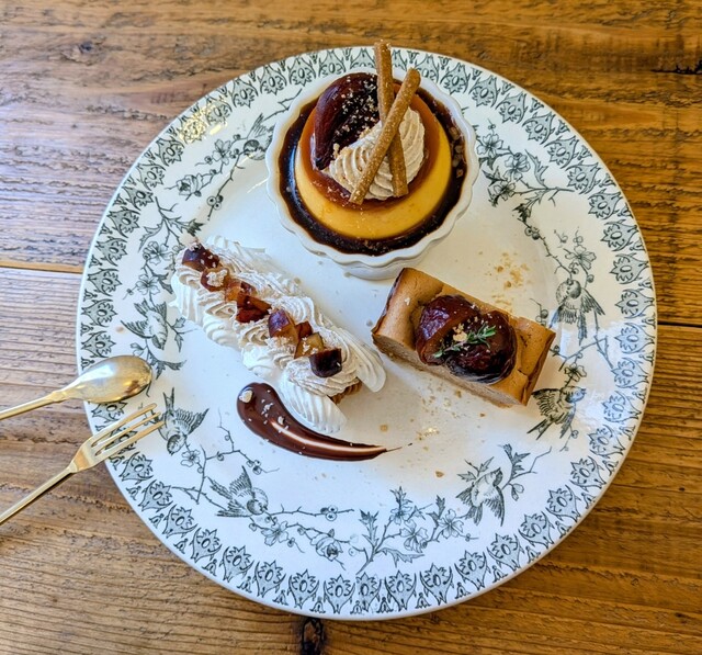 栗のムラングシャンティ 650円、クラシックプリン(栗ver.)650円、栗のチーズテリーヌ 750円✨️小鳥のお皿やちょこんと置いてくださるカトラリーもすごく素敵です♡