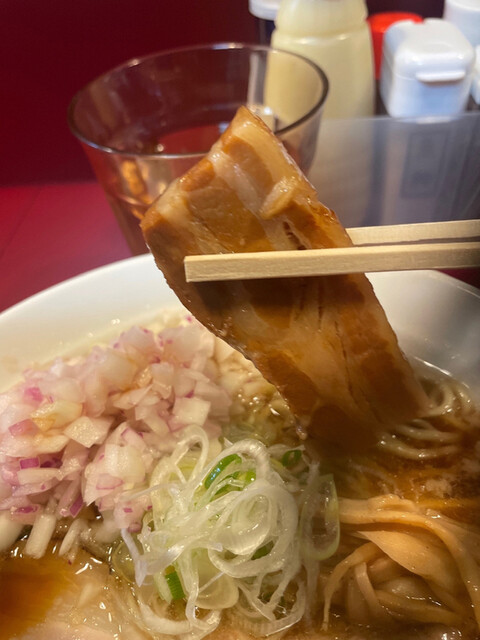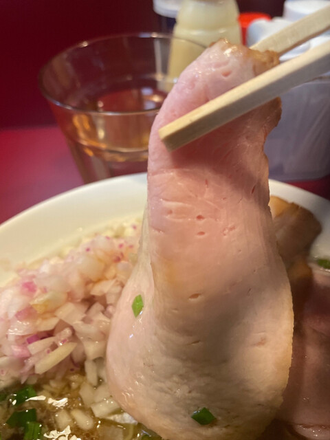 チャーシュー麺と思えるほどの立派な3種のチャーシューを主役にメンマ、ネギ、トッピング増しにした玉ネギです。チャーシューがそれぞれいい雰囲気の味を出してます。