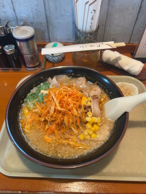 そして間も無く着丼。やはりボリューミー!もやし、コーン、ニンジンなどの野菜がたくさん入っててチャーシューも小ぶりながら4〜5枚は入ってます。