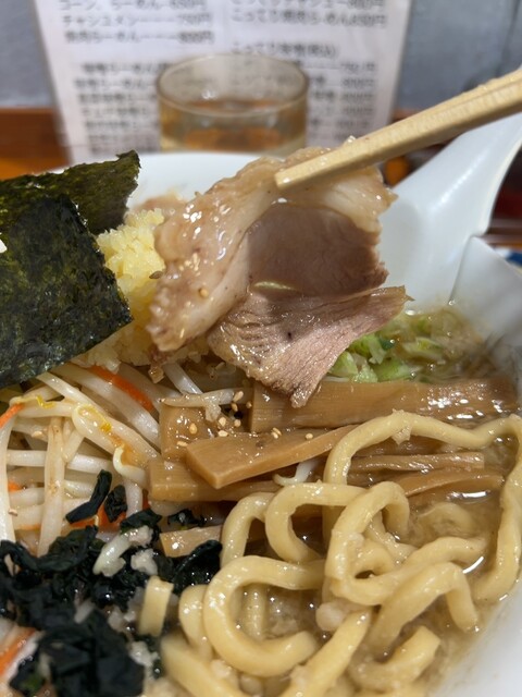 具は4〜5枚はあるかと思うチャーシューともやし、ニンジン、コーン、ネギ、水菜の豊富な野菜類とメンマです。ザ・味噌ラーメンといった感じですね。