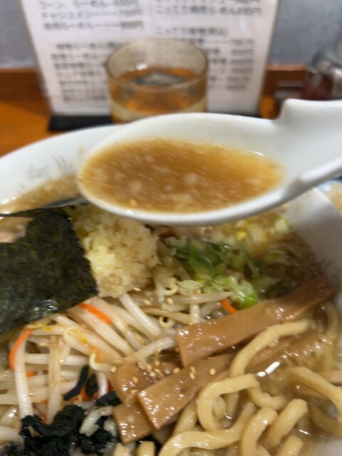 とりあえずスープから。スープのベースはこってりらーめんでしょうね。豚骨ベースのクセのあるスープは塩分、濃厚さ共々ベストな状態です。このスープって本当にここのオリジナルですよ❗️