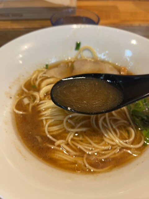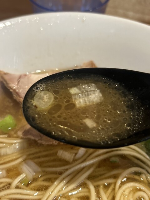 そして待つこと9分ほど。先客もまだ食べてなかったから予想通りの時間でした。そして濁り系でパッと見しお?と思ってしまうビジュアルです。そしてスープを一口。