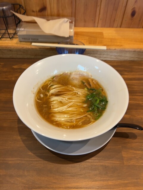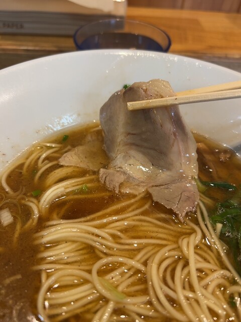 そして待つ事6分ほど。パッと見昼ラーとあまり変わりないです。まずはスープを一口。ベースは昼と同じと思いますが塩分を含め全体的に控えめです。そのせいかわかりませんが旨みが昼より感じます。脂感もしっかりあり旨味もあり、それでいて昼よりアッサリなので朝にはピッタリ❗️