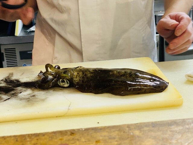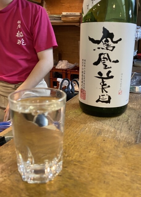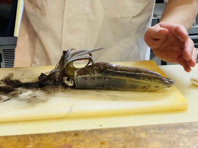 12月中旬のそれも金曜夜、予約して2人での訪問です。本日は、~鰤たたき、又は当日水揚げ鮮魚のたたきと地金目鯛 全国の厳選日本酒飲み放題付き〜お席のお時間2.5時間〜〈全7品〉おまかせ8500円コースを頂きました。此方は千葉県館山の船形港直送のお店です。板さんが目の前のカウンターに座り、活イカが捌かれたりするのを見ながら、料理をいただけます。