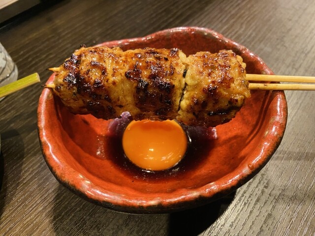 すだち酎ハイ、親もも、月見つくね、肝塩焼きごま油を追加。月見つくねは大きな肉団子が三つついており食べ出があります。