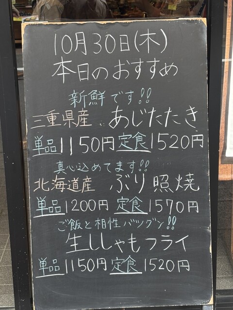 メニューが多くて決めるのが大変ですが、ミックスフライ定食(エビフライ1本、アジフライ1枚、牡蠣フライ2個)と別注文のタルタルソースを注文しました。
