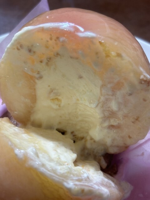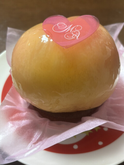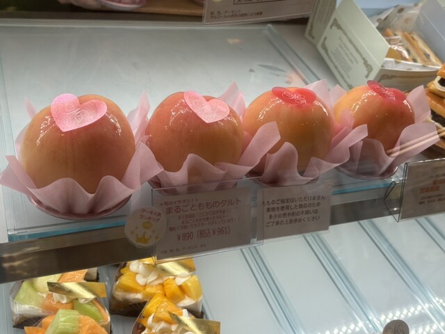 以前モンブランが美味しかった店に別のケーキを挑戦したく再訪。店前から『もものタルト』の掲示がされており、他の客もこぞって購入していたのが『まるごともものタルト』
