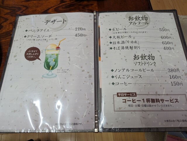 冷たいそば、温かいそばの他に丼物、単品メニューもあり、宴会コースなどもある。