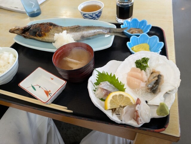 ニシン1尾たっぷりの大根おろし、塩辛小鉢、お新香、味噌汁はホタテの稚貝、刺身は生ホタテ、〆ニシン、タコの三点盛り、ご飯のセット。