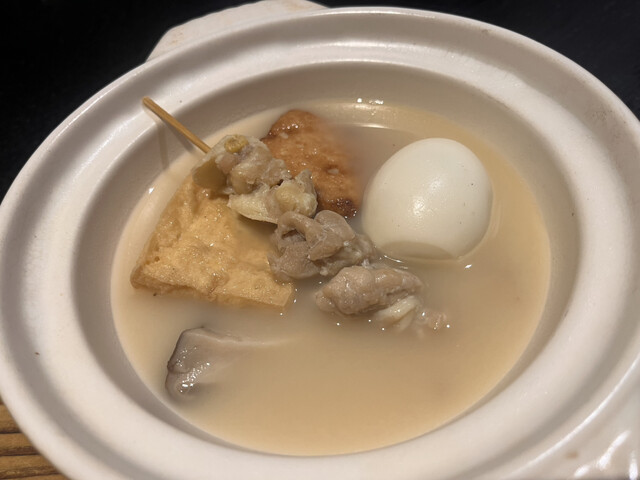 注文は、以前も他のお店ではいただきましたが、鶏白湯出汁のおでんや、鶏の刺身などをいただきました。