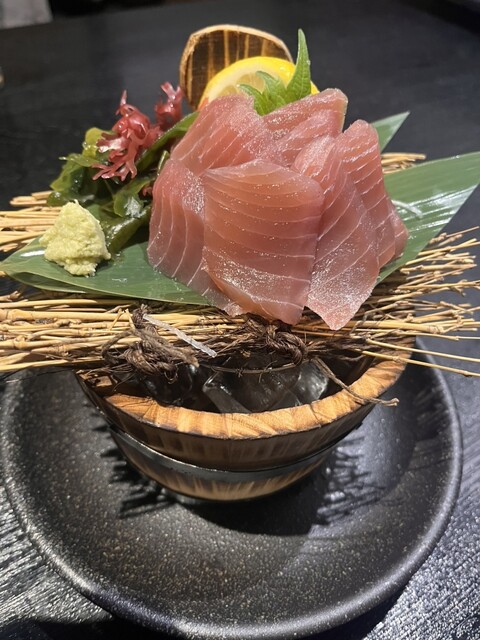 炭火焼を桶で提供される、豚トロはジュージューと音を立てていて食べる前から美味しそうでした。実際に美味しいのですが味だけでなく音でも楽しめるお料理もいいですよね。