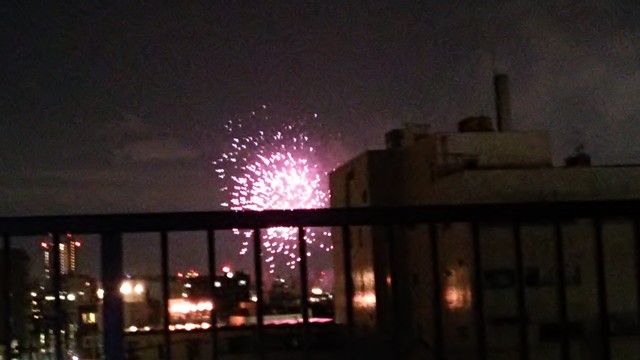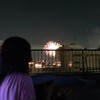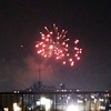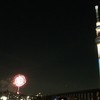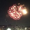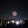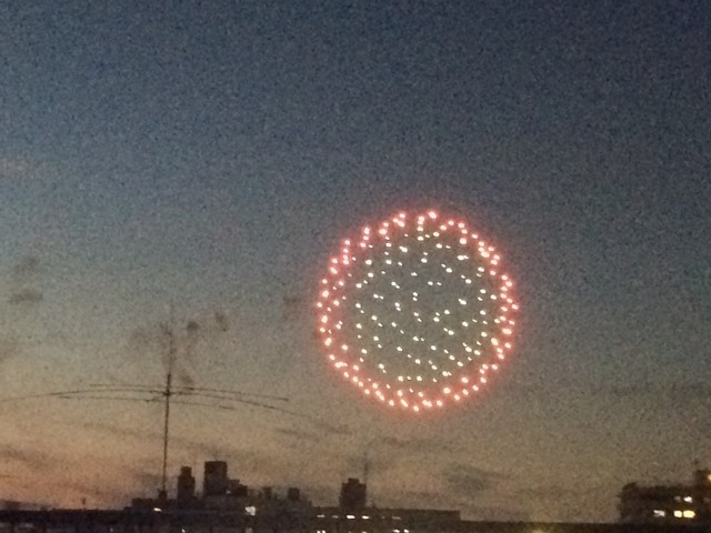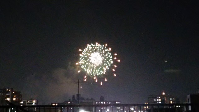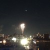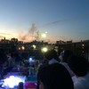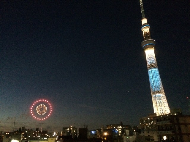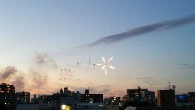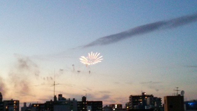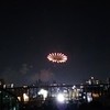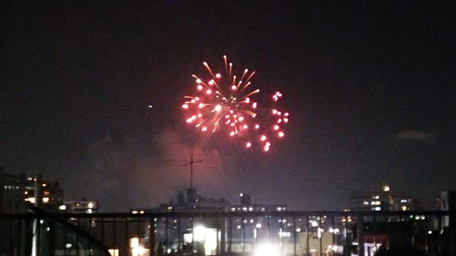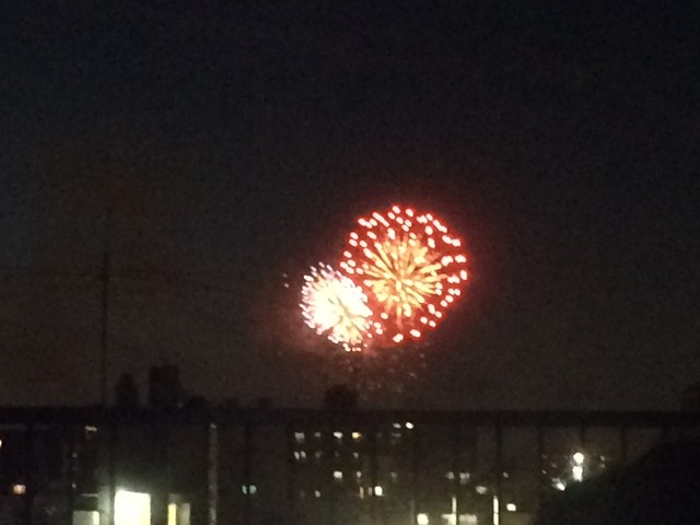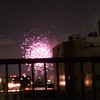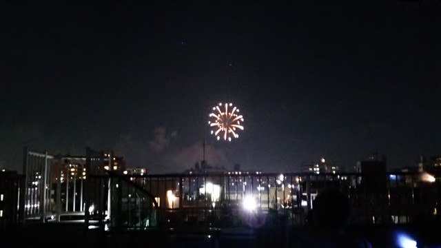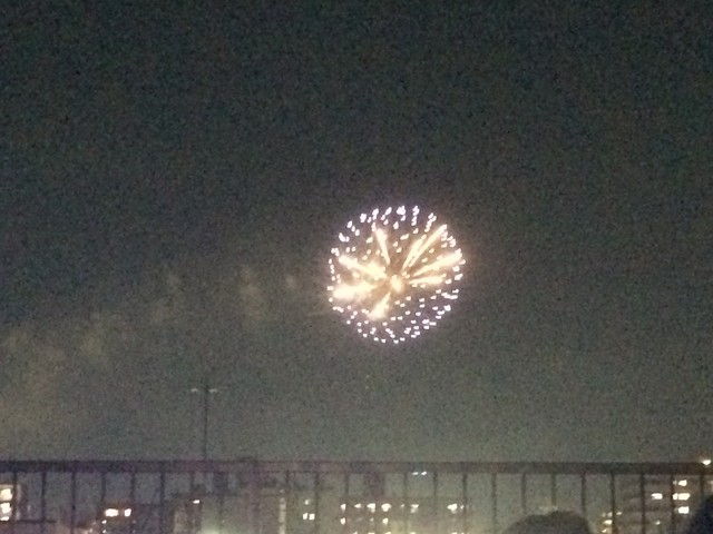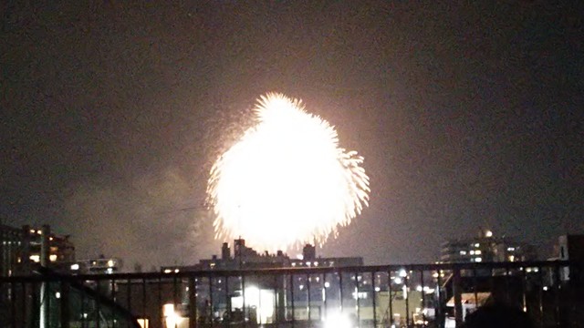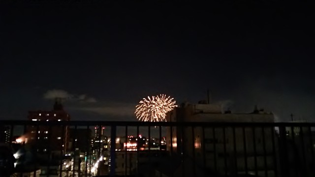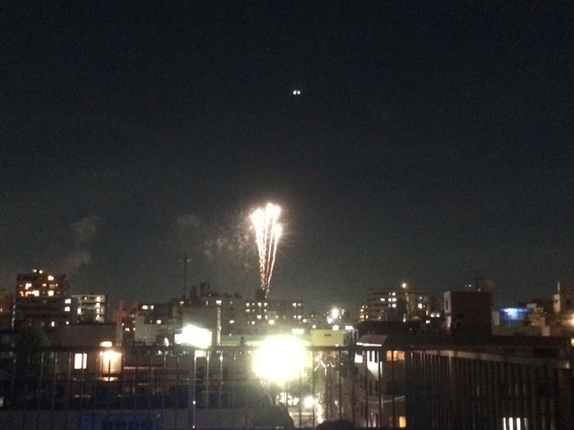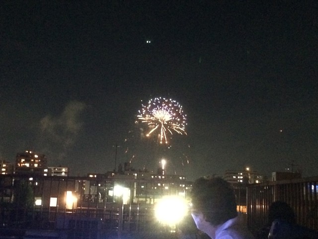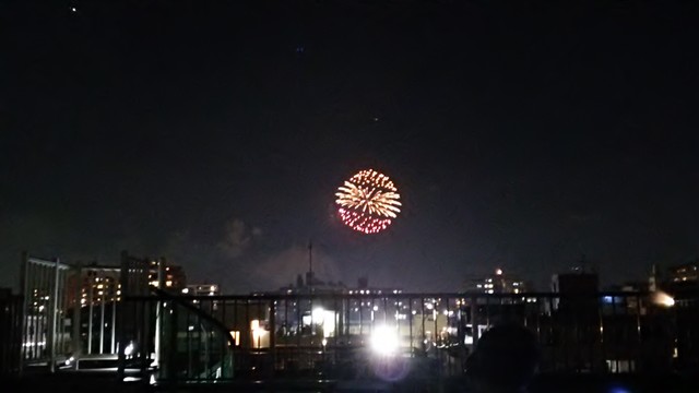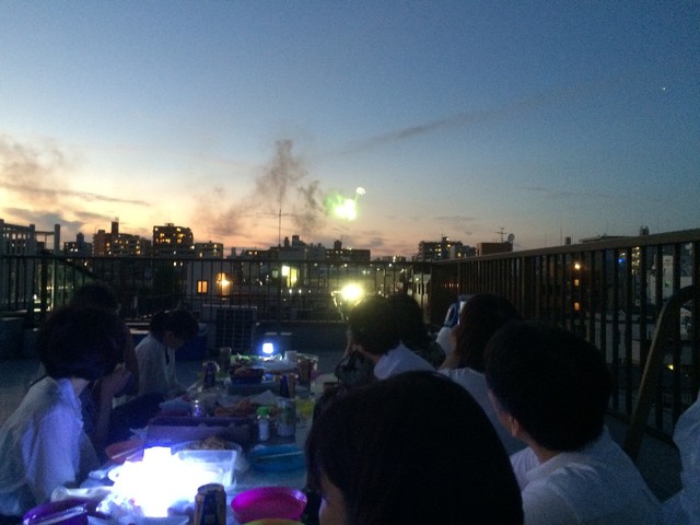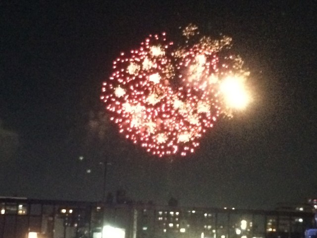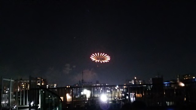 諦めていたら、Facebookで、近くに住む先輩から、花火見物のお誘いがあり、4階建てのビルの屋上から見られることに(*^▽^)/★*☆♪