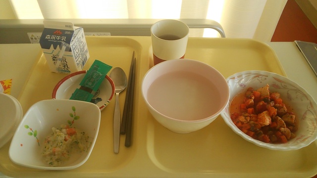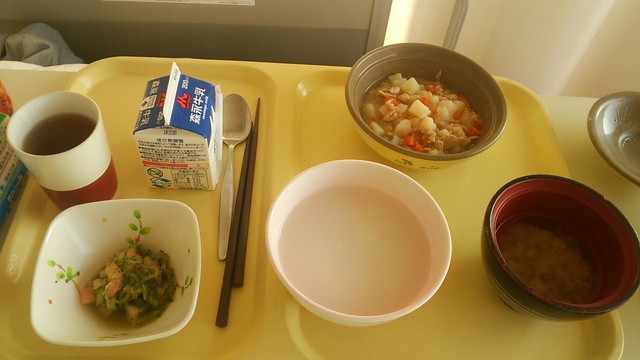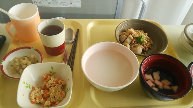 術後3日目の昼食(三分粥&里芋鶏肉味噌煮)