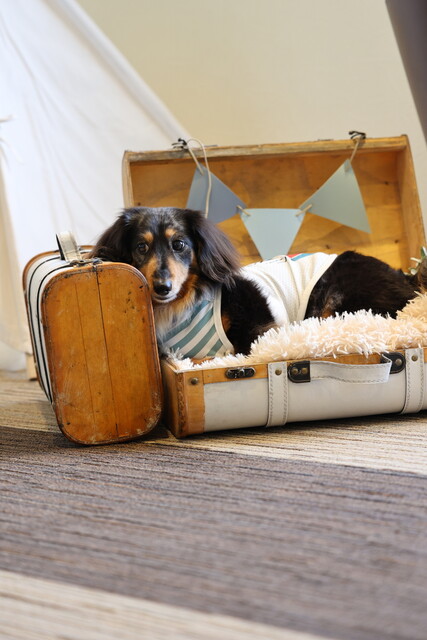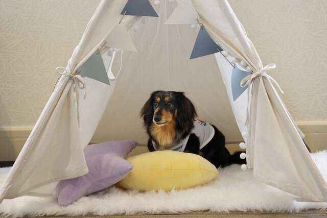 さっそく、同フロアにあるドッグフレンドリーラウンジへ行ってみると、ワンコとの撮影用の小物やゴージャスな椅子、可愛いテントなどが置いてあり、ドリンクも無料でいただけるお部屋で、しかも、私たちの貸し切り状態。